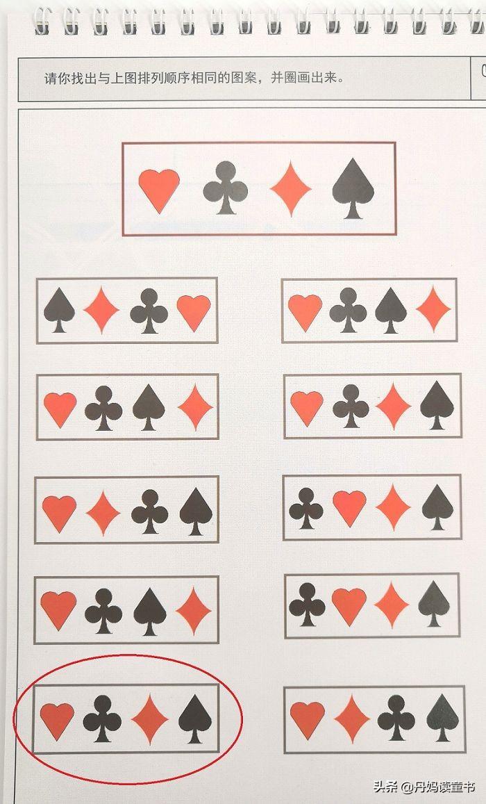 相信你已经开始进入答题状态了,我们再来个符号化顺序练习,请你找出与最上面扑克牌的花色排列顺序相同的图案。