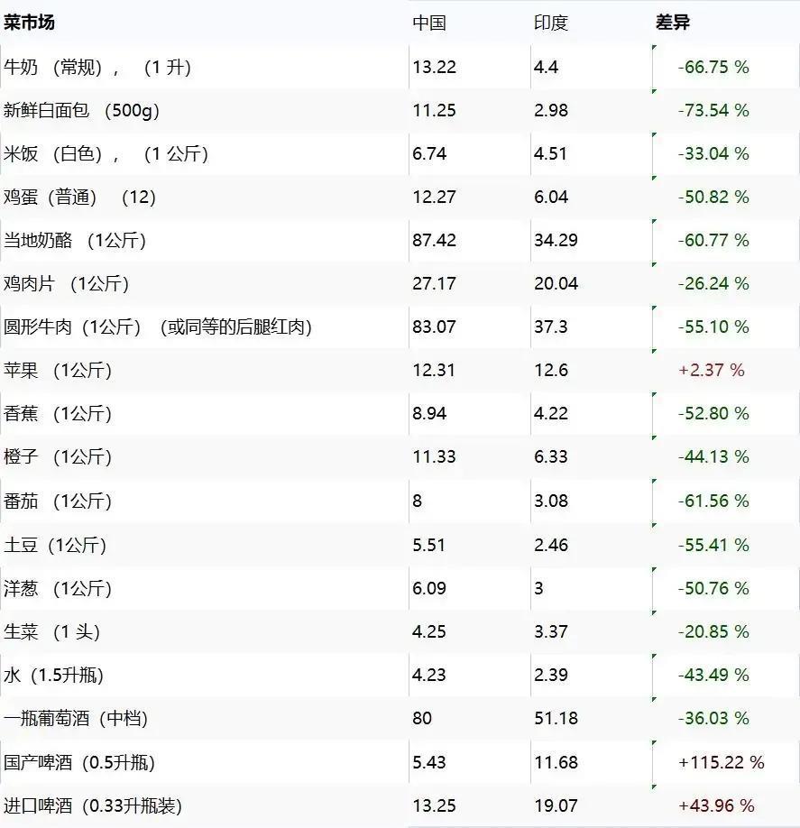 下面是一组中国和印度菜市场的调查报告数据,单位是人民币,通过对比可以看出,虽然印度的工资水平比国内低,但他们的消费水平一样比国内要低得多。