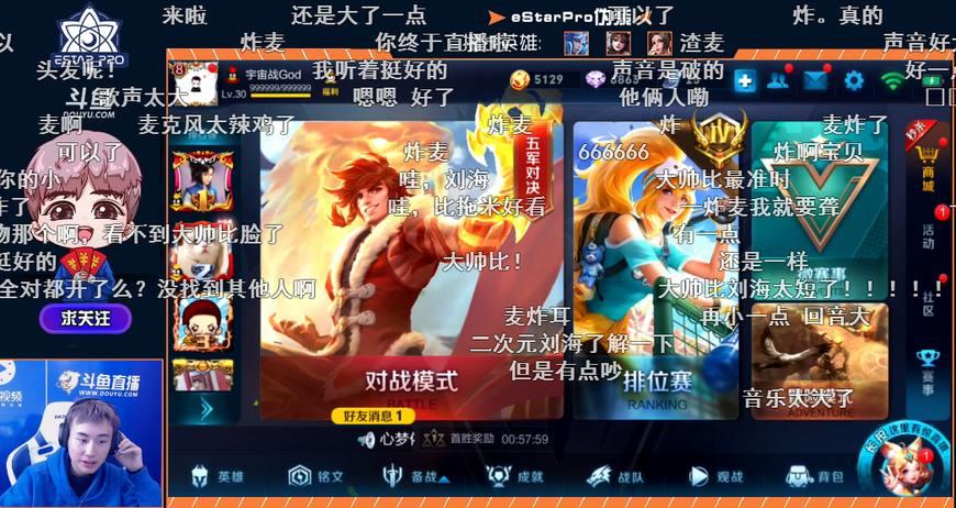3月16号,eStar战队开启了在斗鱼的首秀,eStar伪装非常准时,18点就开始了直播,网友们弹幕纷纷表示“真准时”“他俩人呢?”“太帅了”等等。伪装是eStar战队的全能王,擅长多个位置的诸多英雄,例如露娜,宫本,花木兰等等,打法凶悍,意识超群。