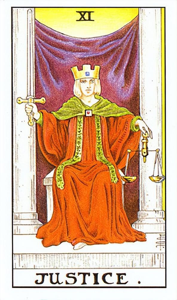 仔细看看牌中的女子,她像不像一位法官呢?法律事务与正义关联密切,所以正义牌也常与法律事务有关,包括诉讼和各种契约的签订。