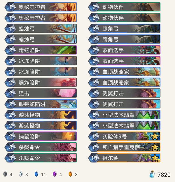 狙击和捕鼠陷阱的加入强化了奥秘猎的控场能力,同时奥秘的多样性也增加了对手猜奥秘的难度和犯错误的可能性。如果想要进一步增加奥秘的话,第二张眼镜蛇陷阱可能会是不错的选择。不过仍然需要注意奥秘与随从数量的稳定配比,毕竟太多的奥秘很可能会导致你在整局游戏中都处在挂机射箭的状态。