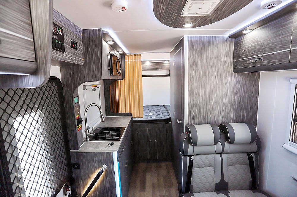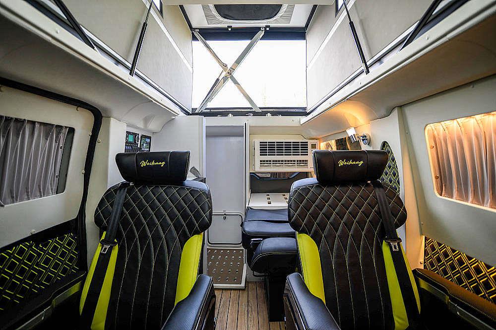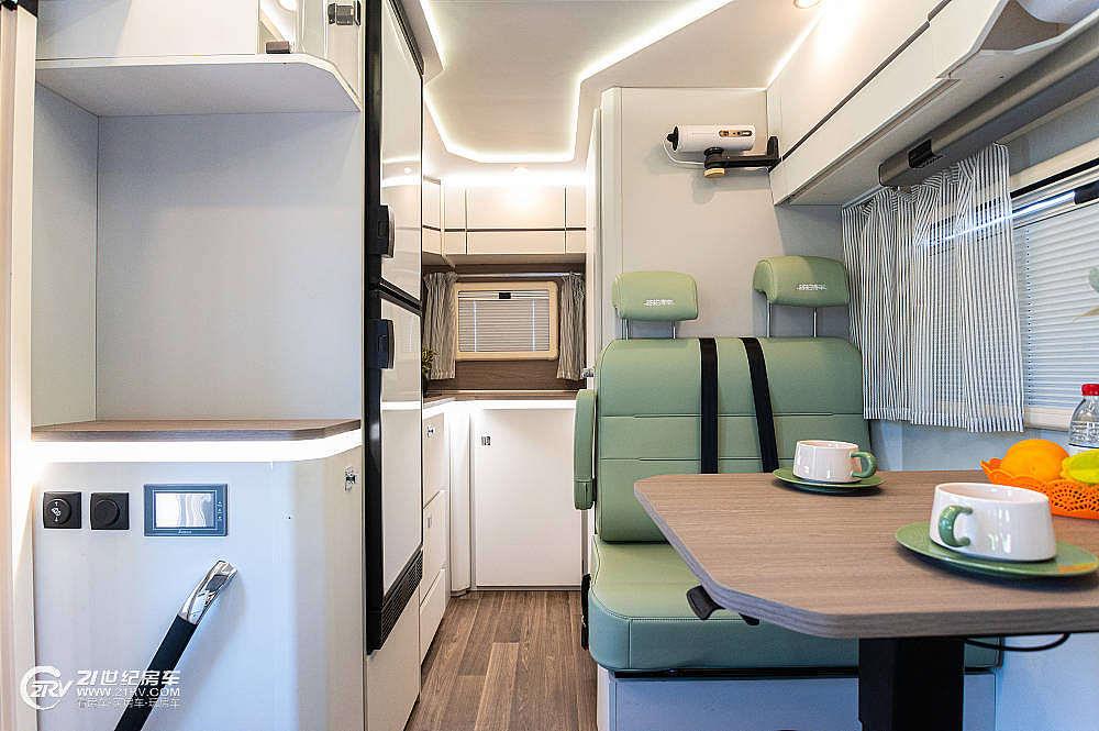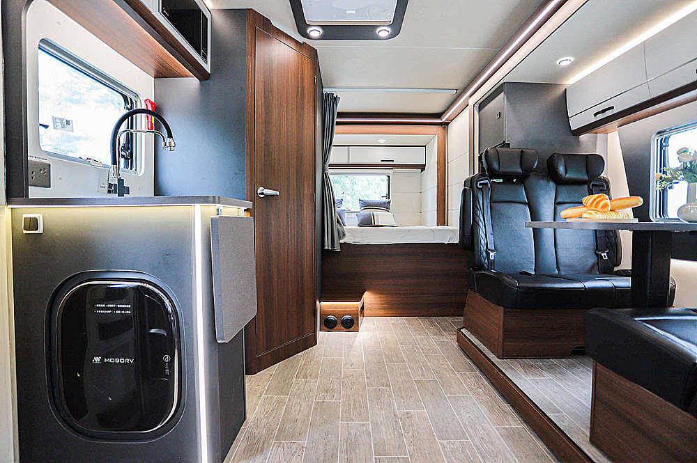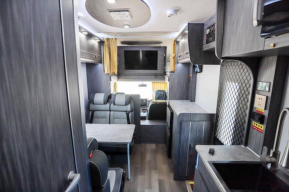 车内采用专用环保内饰板+防水耐磨PVC地板设计,整体布局通过划分前中后三个独立区域。从前往后顺序依次为驾驶舱+额头床+对卡座(可拼床)+冰箱/吧台区+厨房区+卫浴间+后横床的布局结构。整车核载6人。