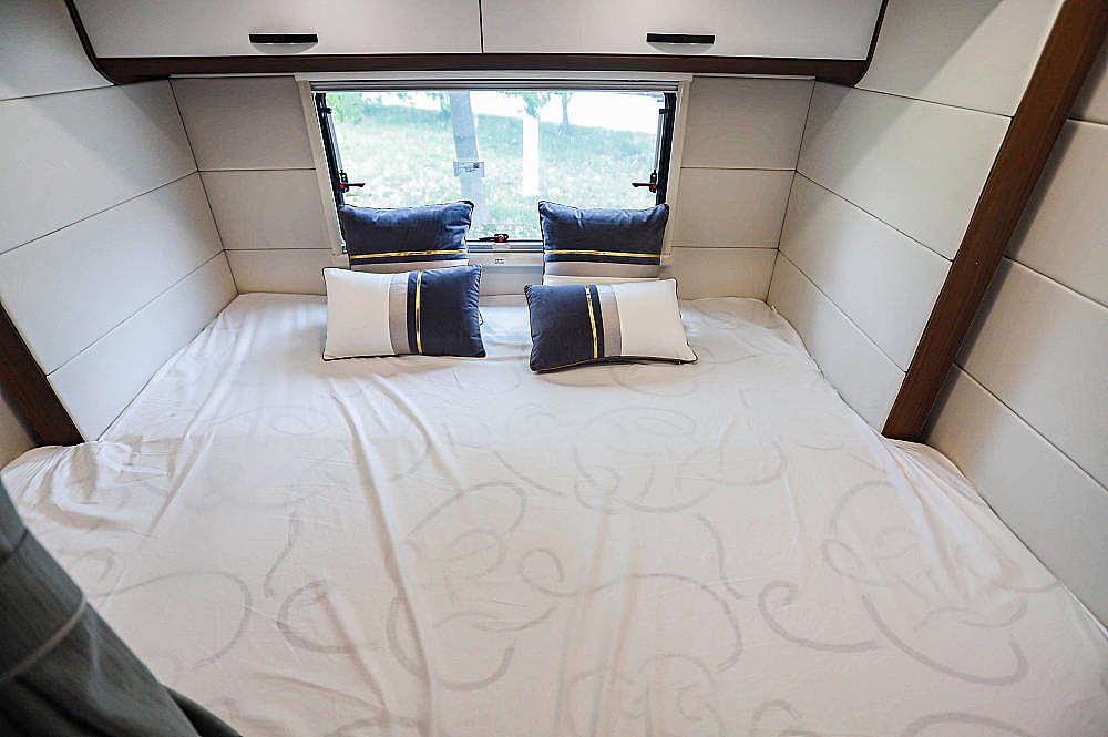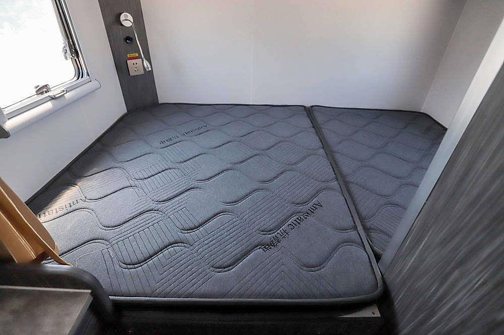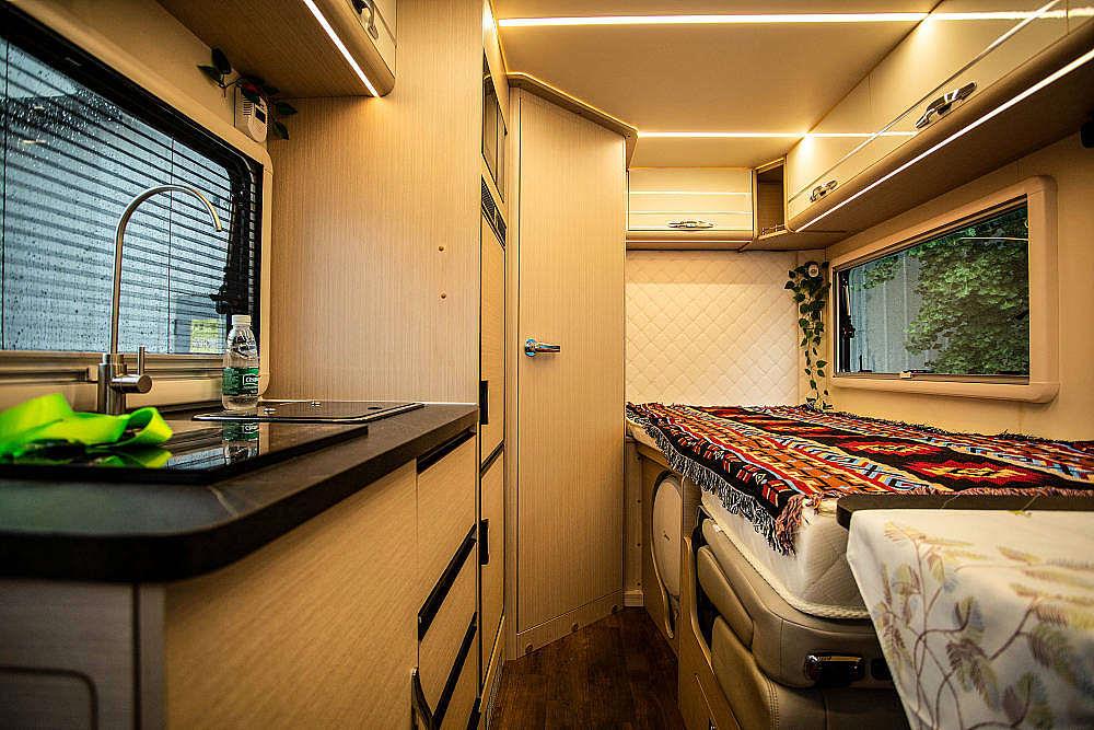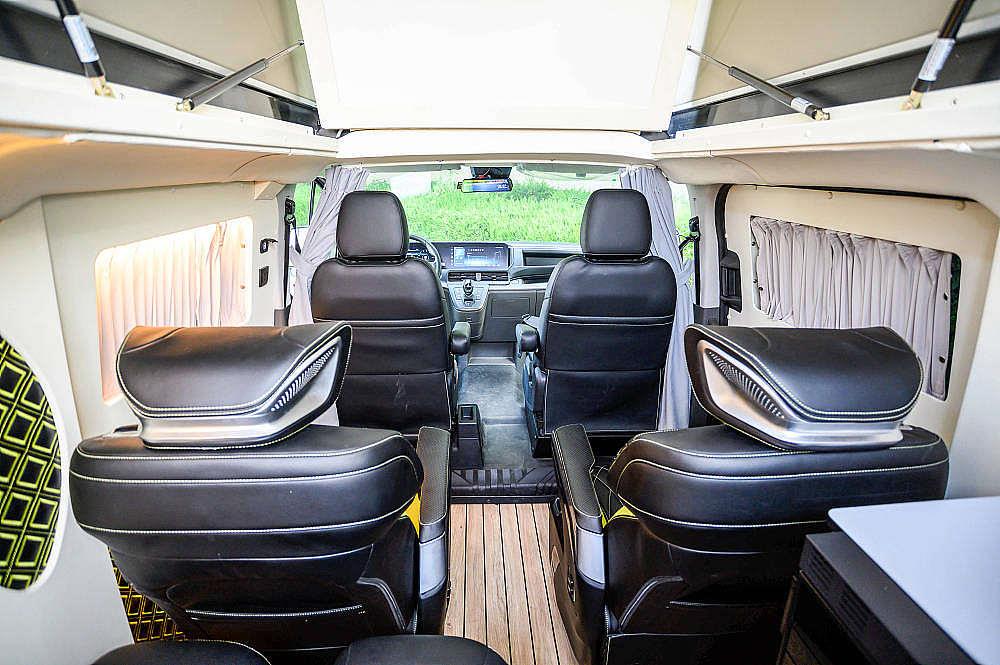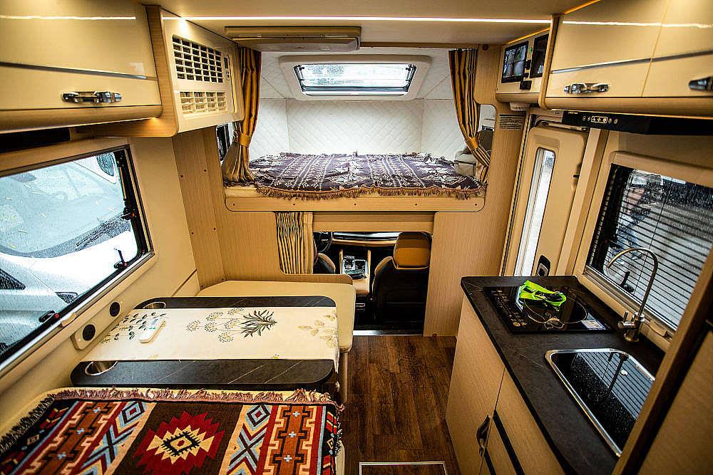 车内采用专用环保内饰板+防水耐磨PVC地板设计,整体布局通过划分前中后三个独立区域。从前往后顺序依次为驾驶舱+额头床+对卡座(可拼床)+冰箱/吧台区+厨房区+卫浴间+后横床的布局结构。整车核载6人。