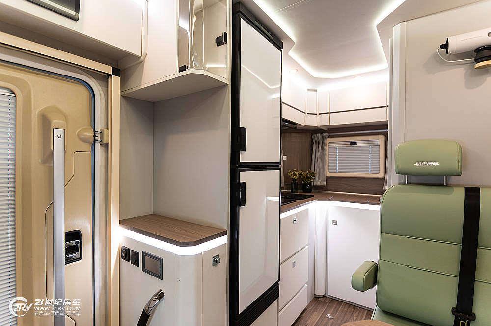 厨房区呈L型排布,集成了不锈钢水盆、电磁炉、抽油烟机、房车专用150L双门式大容量冰箱、微波炉等常用设备,上下储物柜方便放置厨房用具,此处设计有USB接口和220V插座,方便使用各种小厨房电器。