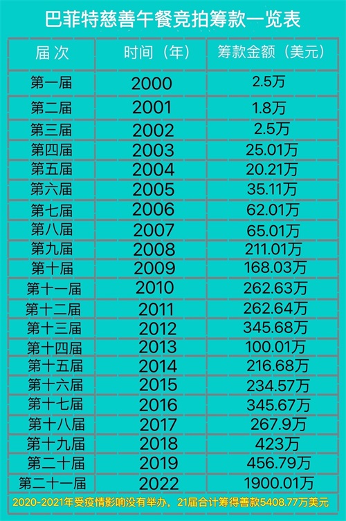 2020年和2021年,由于新冠病毒疫情肆虐全球,这两年的巴菲特慈善午餐被迫取消,没能如期举办。其他年度的巴菲特慈善午餐,每年一次均如期竞拍、举行。