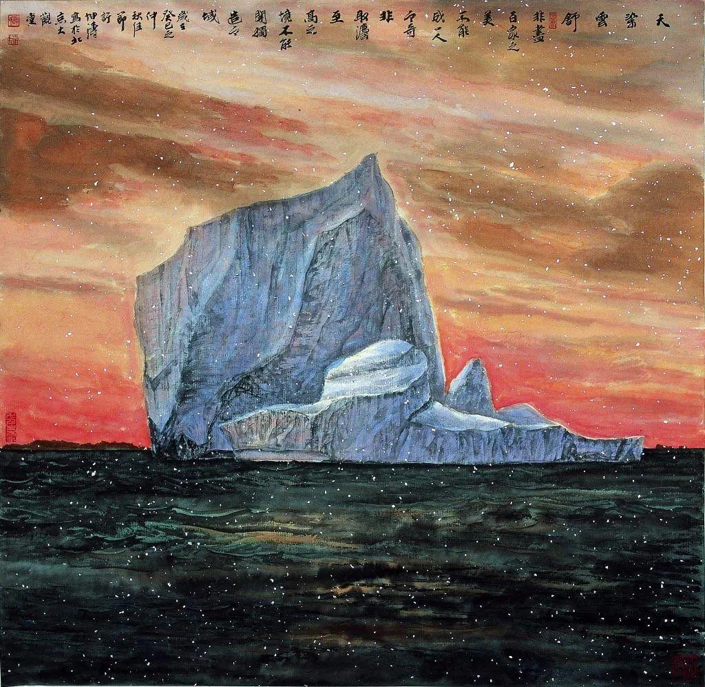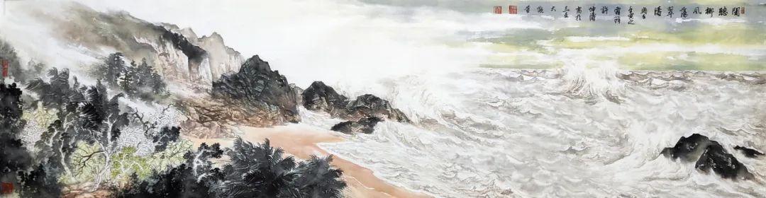 画中众幅山水海洋,是可见于层峦之叠嶂,亦是可见于海天之浩荡,前者山水乃是蕴幽静于凝练,后者波涛则是寄情怀于奇绝!但无论是其作品画面最终是以前者气象为彰显,还是以后者气象为彰显,整幅作品的审美景观可谓都是离不开许坤涛先生自身文人心迹的全面加持!因此我们观赏许坤涛先生的这些丹青画作,也就不能仅是以单方面的视觉感受为主,而是要更深入的去品味其内在的自然蕴气和精神格调!画幅所展,即是可赏可鉴之佳品,画意所感,则更是可游可居之妙境,而如此观之众幅,也真可谓是隐居山海而畅神于其间,文人意味,尽显无遗!