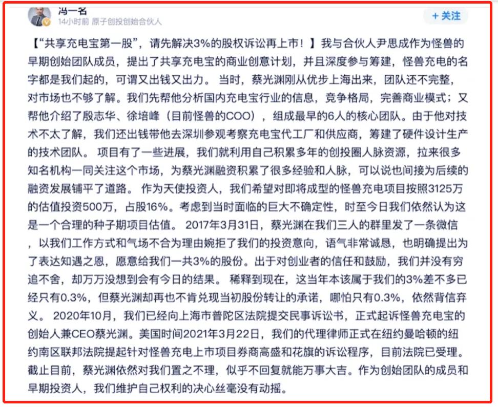 而今年赴美上市的怪兽充电,也在上市前夕遭遇诉讼。怪兽充电上市前一周,创始人蔡光渊遭起诉,投资人追讨2000多万股权,这导致怪兽充电上市也一度陷入波折。