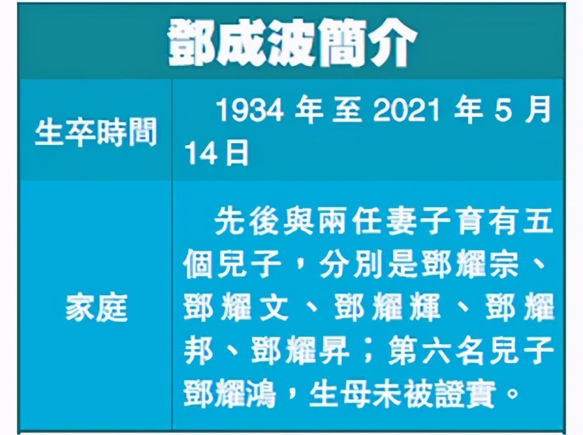 人到晚年,一般都想维持现状安稳。而能让波叔这样晚年还频频卖铺的可能是坊间说的「救仔」了。波叔与第一任妻子生了三个儿子,与第二任妻子生了两个儿子。而在波叔的追悼会上,被坊间盛传多年的私生子亦得正名,在灵堂一字排开子孙的花牌,五子邓耀升之后,还有一个花牌下款写着「儿子耀鸿」。
