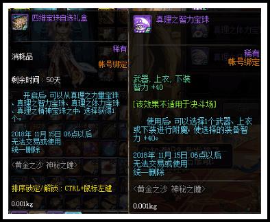 首推的自然是国庆黄金之沙活动商店可以兑换的真理之智力宝珠,可以给武器、上衣、下装附魔40点智力。每天上线做做活动,很容易就能将2个四维宝珠自选礼盒换完。