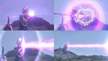 挥动暗黑欧布圣剑发出,外形为紫色且附有锯齿,给对方造成巨大伤害。