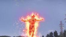 按动[欧布圆环NEO],全身燃起火焰,向敌人扑过去,是威力巨大的技能。