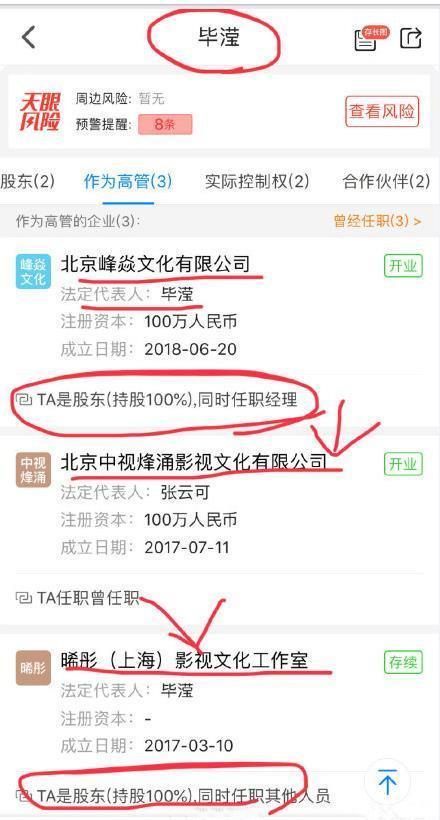 疑似毕滢早年的网络言论被曝光,并被查出毕滢百分百控股张丹峰的公司和工作室,同时还担任公司高管一职。