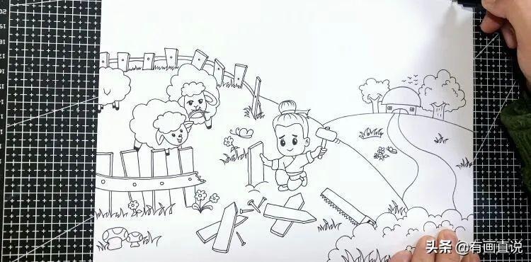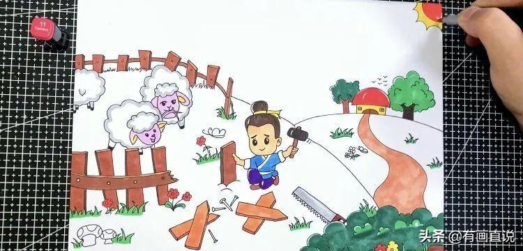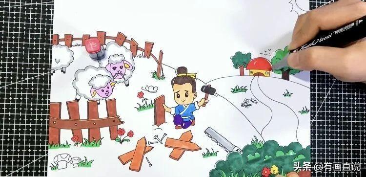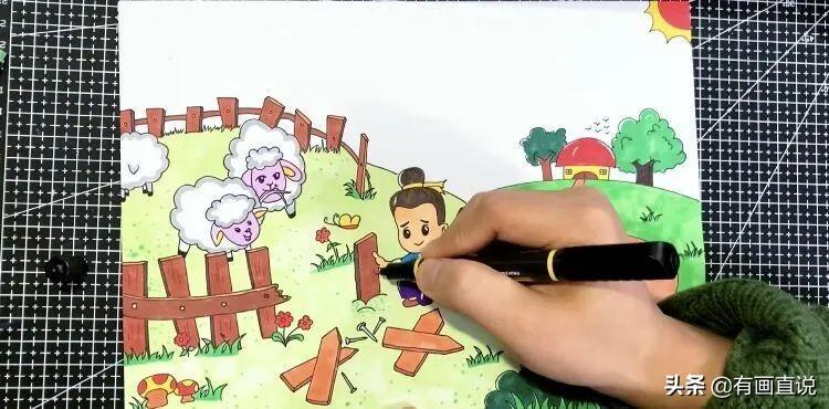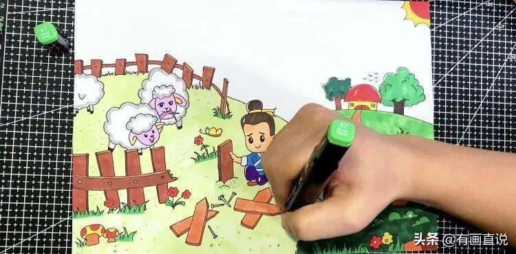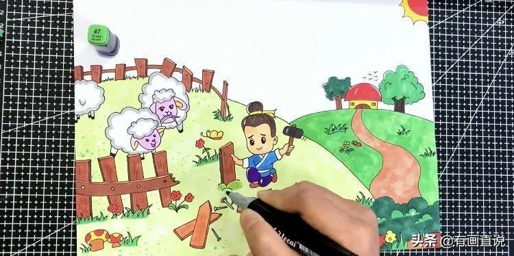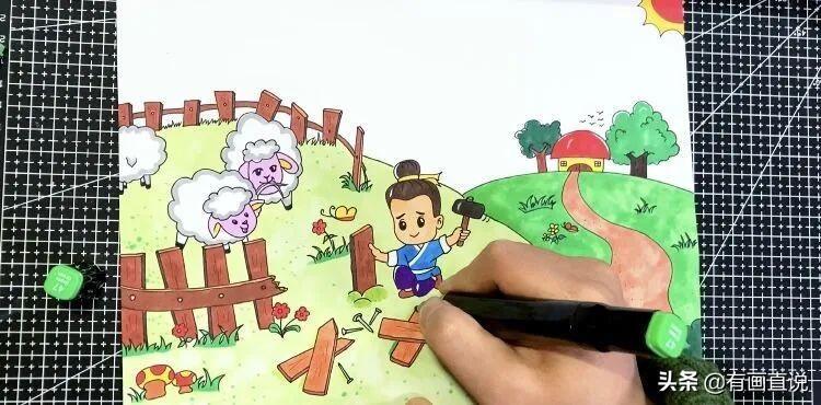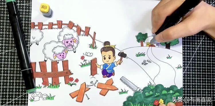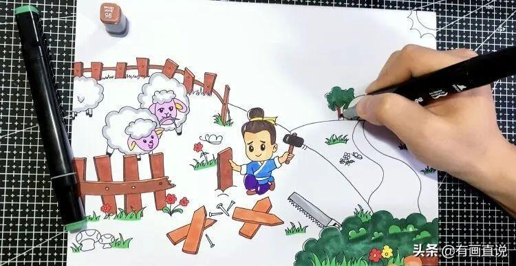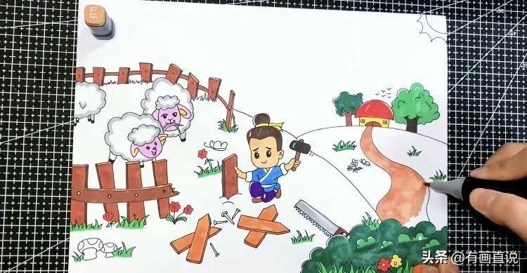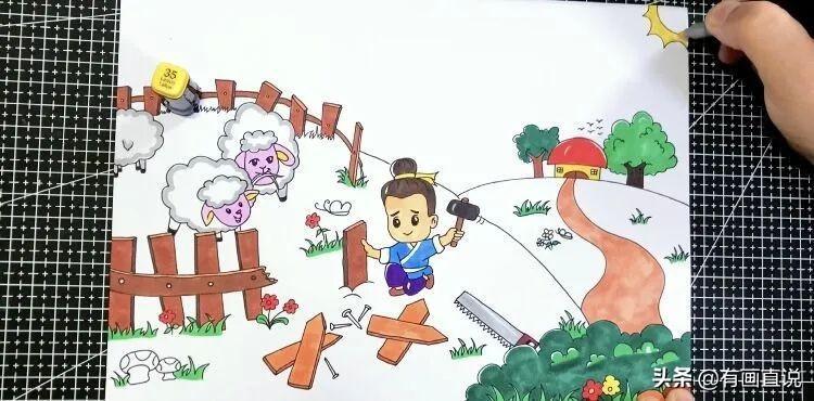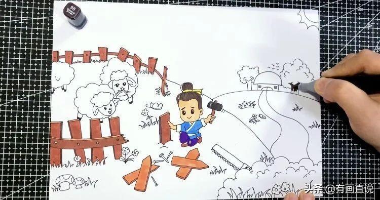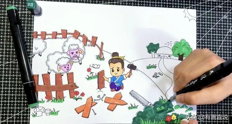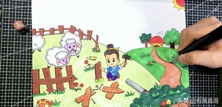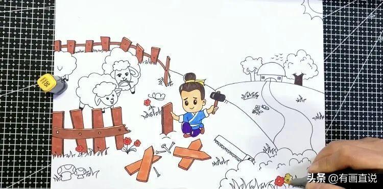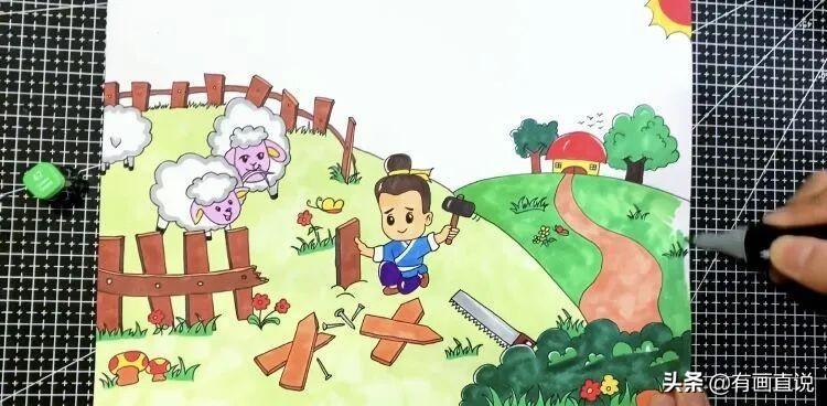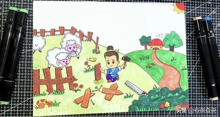创意儿童画/手抄报模板:寓言故事亡羊补牢画法,卡通简笔画风格