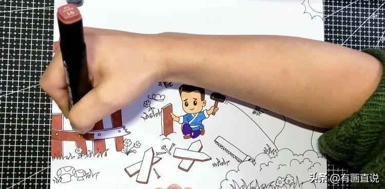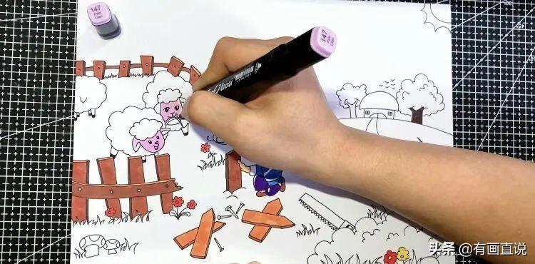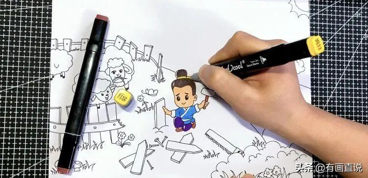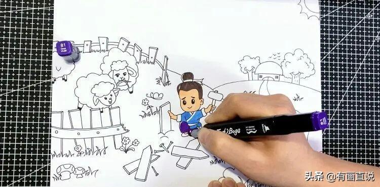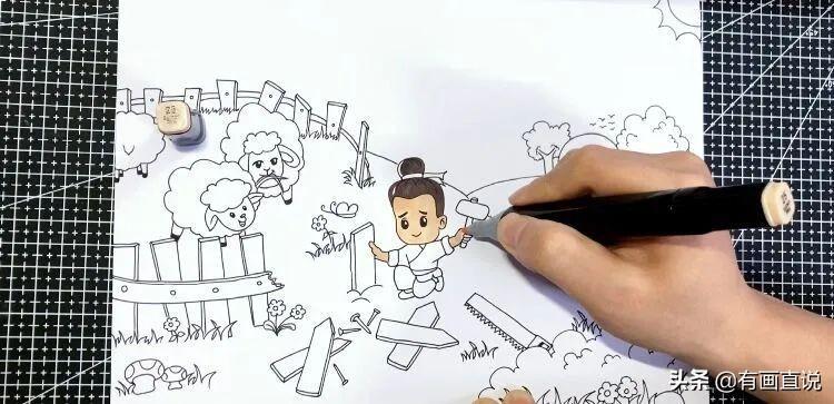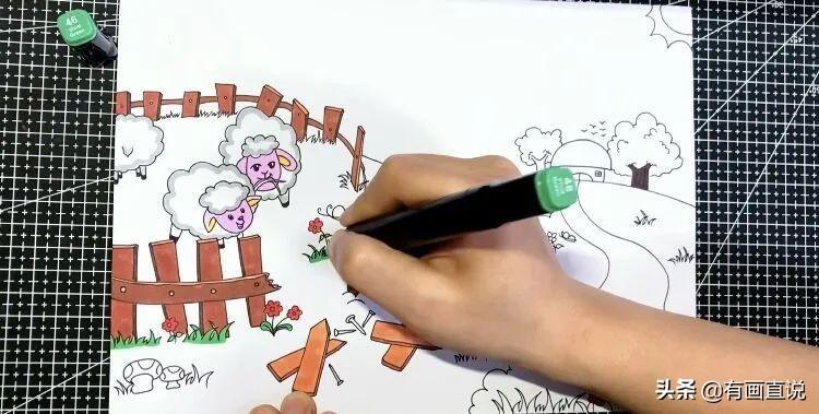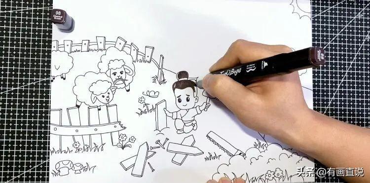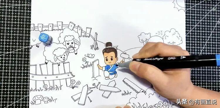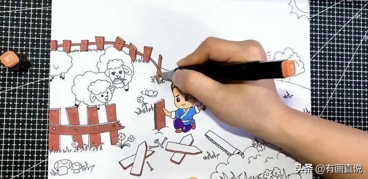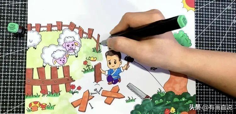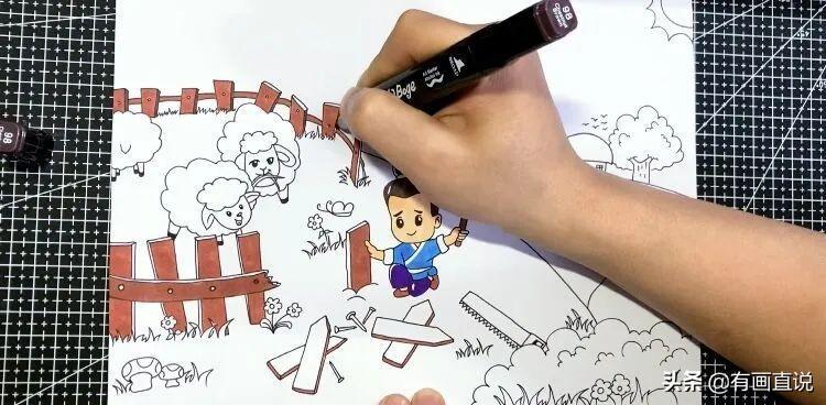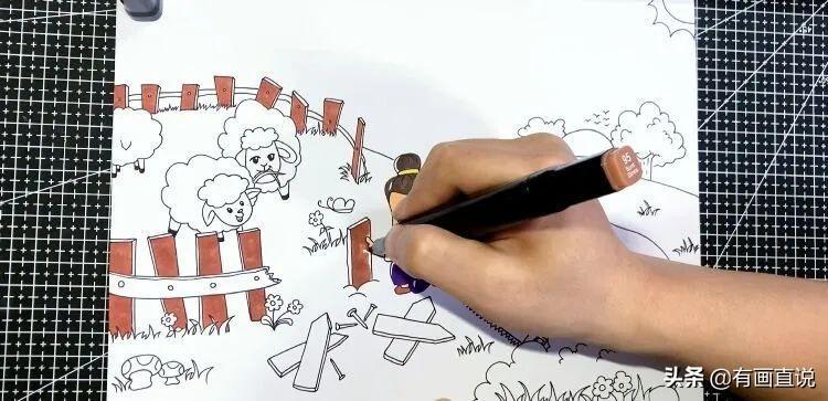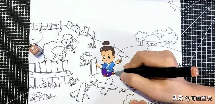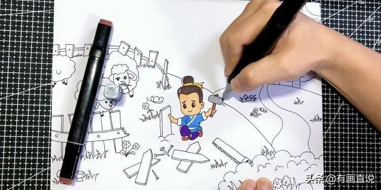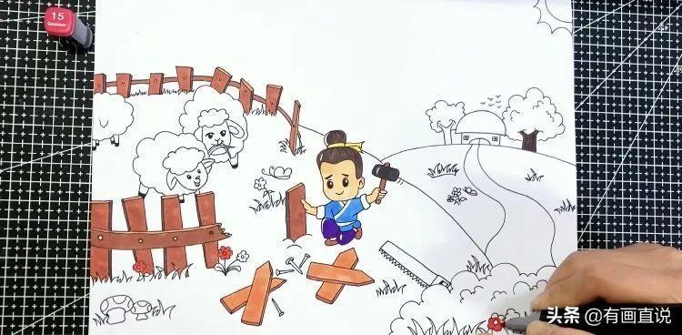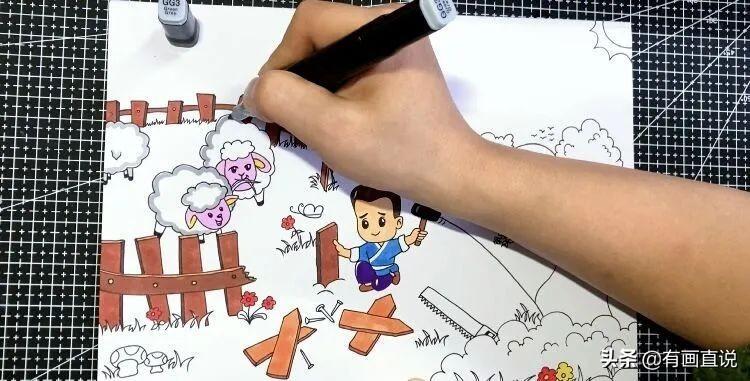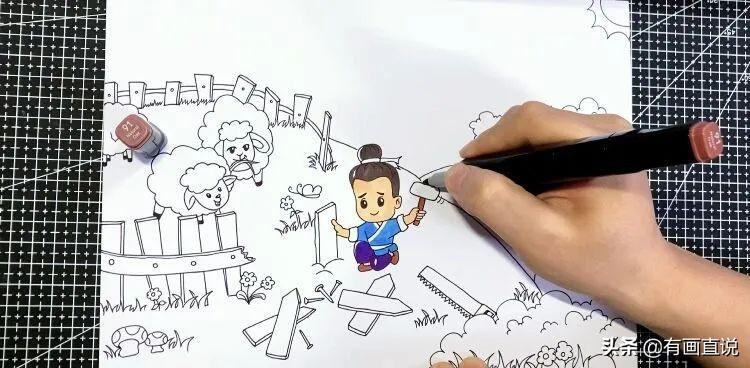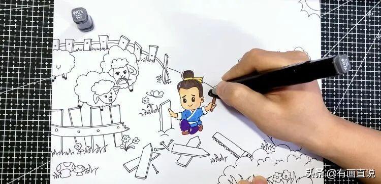 创意儿童画/手抄报模板:寓言故事亡羊补牢画法,卡通简笔画风格