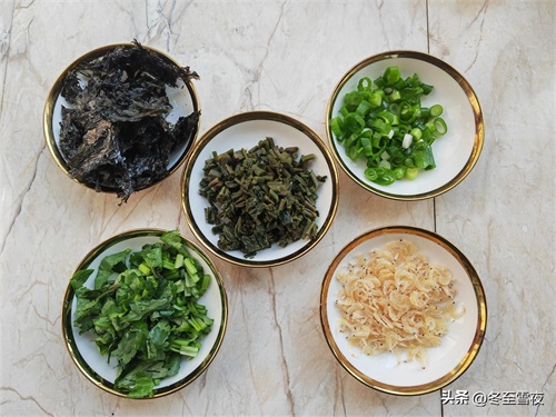 1.准备好所需材料,香菜和小葱切小段,紫菜撕成块,香椿投洗干净,切成小段。