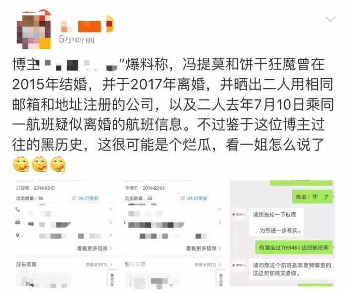 但是就在今天,冯提莫被某知名博主直接爆料出来了冯提莫离婚的消息,在粉丝的眼中还没有结婚的冯提莫一下子就被说离婚,自然是没人相信的,但是该博主却坚持表示冯提莫和斗鱼的主播饼干狂魔曾在2015年结婚,并于2017年离婚,而且还晒出了两人用相同的邮箱地址注册的公司,以及两人去年的时候乘坐同一航班疑似离婚的航班信息。