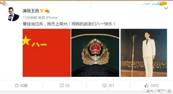 8月1日,今天是八一建军节,曾经是军人的王迅在微博中晒出自己的军旅旧照:“曾经当过兵,我无上荣光!祝我的战友们八一快乐!”,照片中,王迅一脸稚气,脸上画着浓浓的妆,很是青葱。