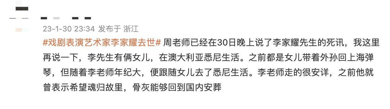 1月30日,演员周野芒在社交平台发文悼念上海话剧艺术中心一级导演、一级演员李家耀先生。据悉李家耀于1月30日凌晨在悉尼去世。