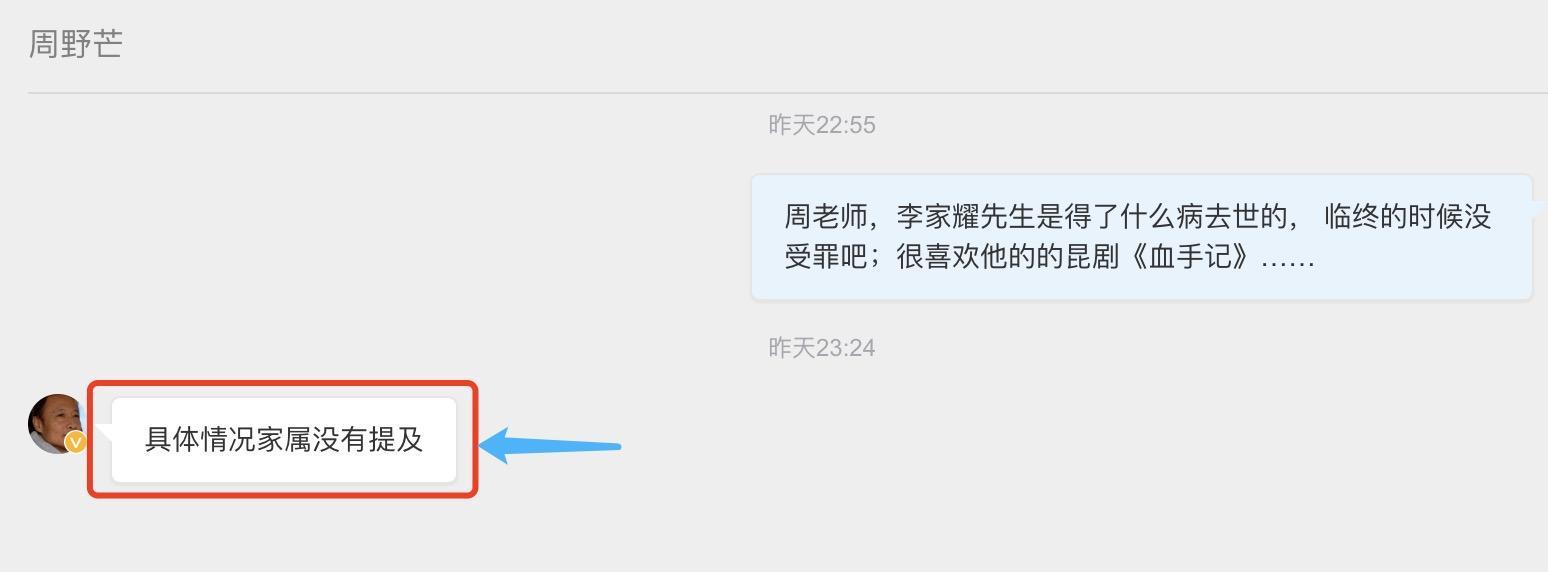 之后我们向周野芒了解李家耀先生病逝的具体原因,奈何周老师并不知悉,具体情况家属没有提及。