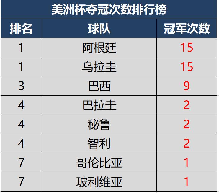 翻开美洲杯105年的历史,到今年已经是第47届比赛,一共有8个国家队获得过美洲杯的冠军,美洲杯历史夺冠次数排行榜如下图。