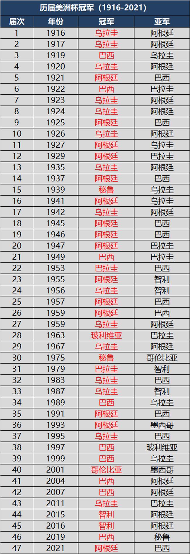 美洲杯的历史悠久,其始创年份不仅远远早于欧洲杯,甚至要先于国际足联世界杯,在1916年阿根廷就首次举办了美洲杯赛,历届美洲杯冠军如下图。