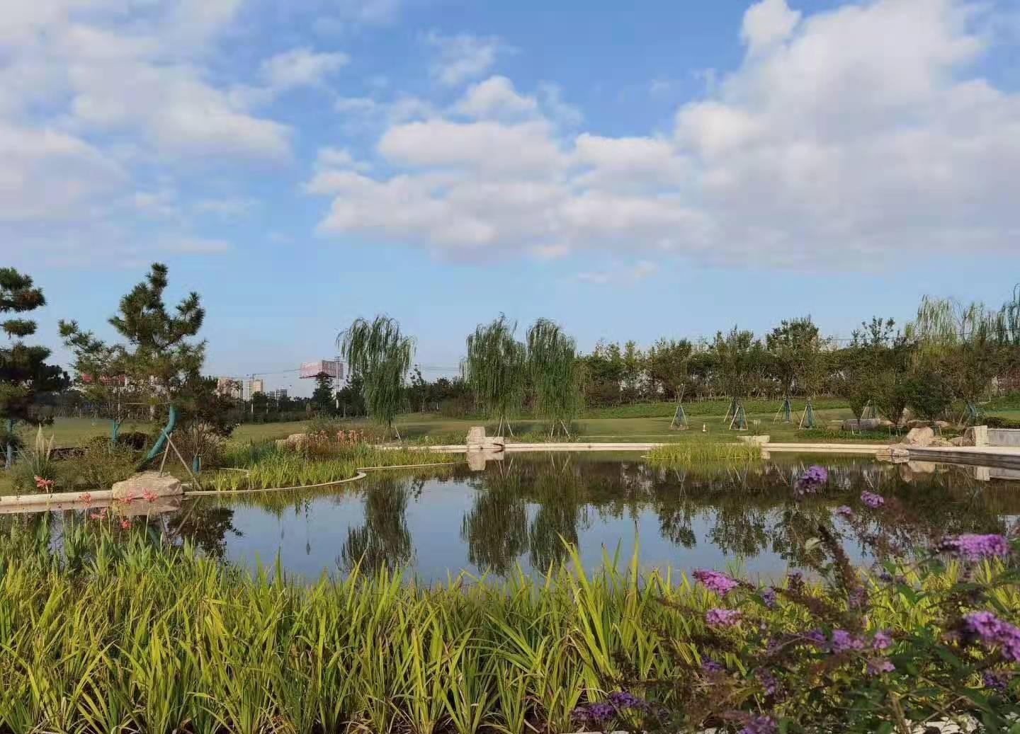 水岸边,大片的落羽杉树形成了翠绿色的天然屏障,为游客送来清凉。在公园内还有美丽的荷塘,荷花绽放,水中鱼儿嬉戏,一幅和谐的画面。