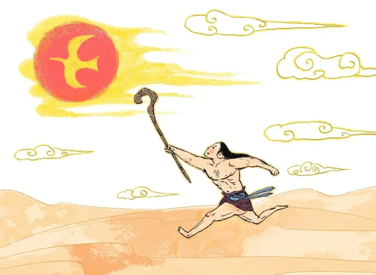 1. 夸父追日:夸父是夸父族的首领,但因为夸父族的生活环境过于干旱,所以夸父想要去追太阳,以寻找更合适的生活环境。他在追太阳的过程中,口渴难耐,喝干了两条长河的水,最终还是因为口干舌燥和疲劳过度倒在了路上。夸父死后,他的身体化为山川大地,他的手杖化为植物,茂密地生长出一片桃树林。