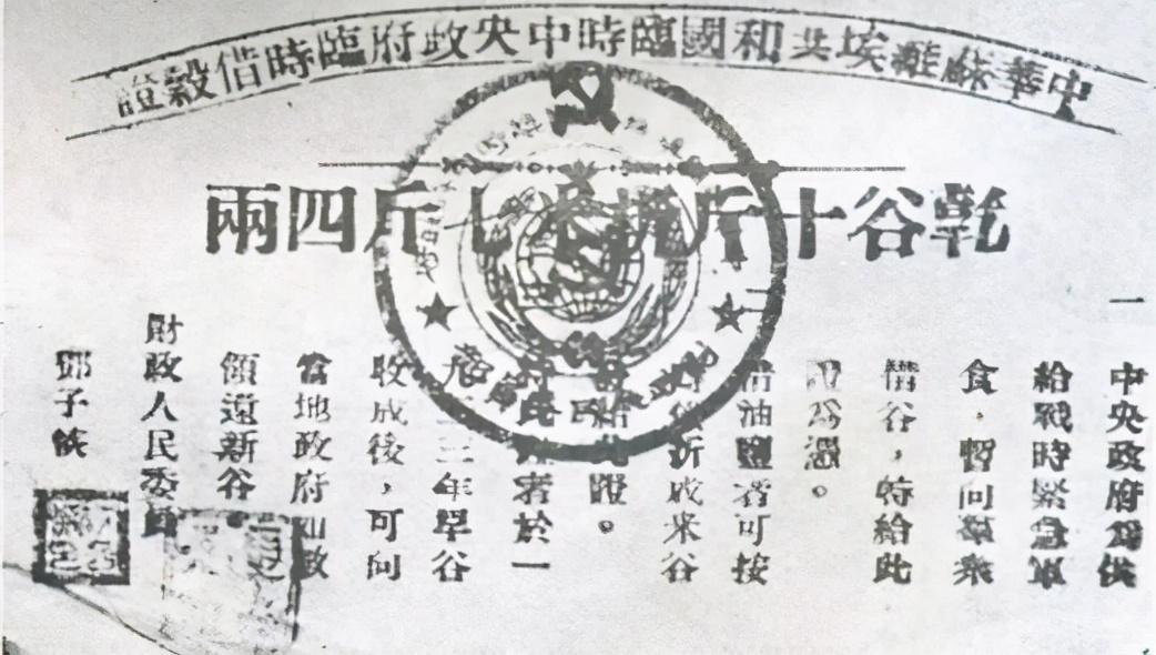 中央苏维埃的临时借谷证。由于中共当时的军事策略被改变为“御敌于国门之外”的阵地战,红军作战一年未能打破“围剿”,造成中央根据地的严重困难。