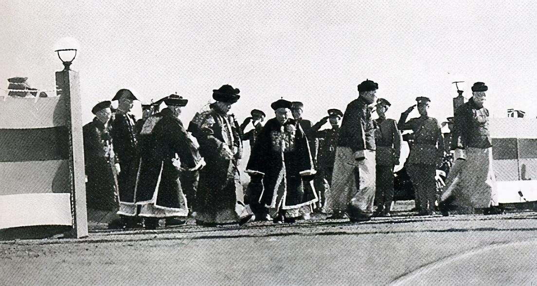 溥仪身穿清朝龙袍,由掌礼官引导,步入杏花村祭场临时垒起的“天坛”上,准备行“告天即位”的古礼。