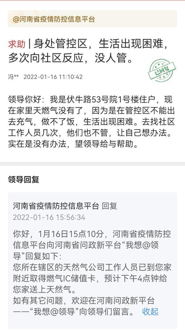 近日,郑州封控区内有市民向顶端新闻“我想@领导”平台及河南商报记者反映,因疫情影响,小区封闭管控无法进行天然气充值,导致家中无法做饭。经过顶端新闻“我想@领导”平台的及时转交,有关部门参与协调沟通,市民所在辖区的天然气公司工作人员已到小区附近取得天然气充值卡,并于1月16日下午4点左右给市民家中送上天然气。