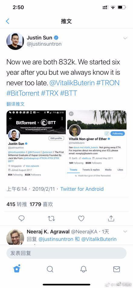 早几天,孙宇晨发推特并@以太坊V神说,我们粉丝一样多啦。可见,波场对粉丝的重视。
