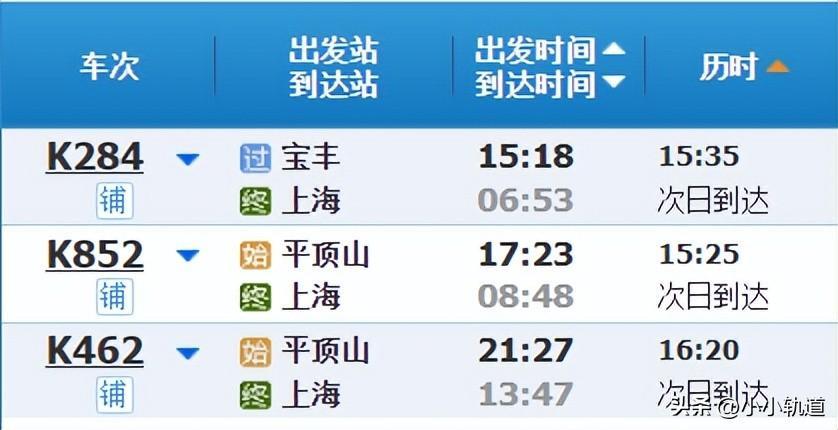 目前,平顶山至上上海每天有3个车次的普速列车,其中,K462次列车耗时为最长,用时为16小时20分钟;K852次列车耗时最短,用时为15小时25分钟。
