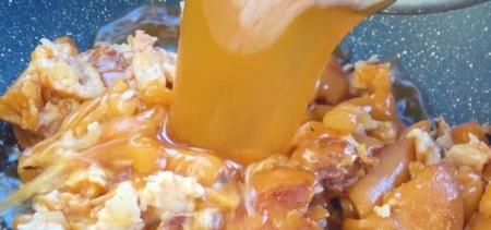 3、葱切段,姜切片,把葱姜,大料,酱油放进锅里中火煮制头骨熟烂。