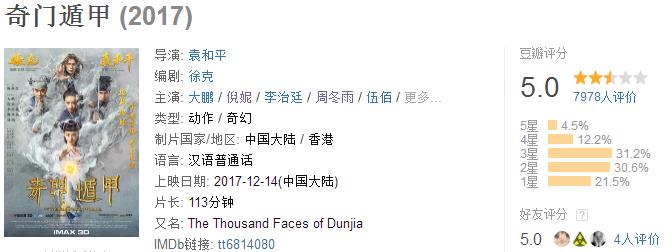 《奇门遁甲》这部片子的问题确实很明显,豆瓣评分5.0分(截至发稿),无论对于导演袁和平,还是对于监制和编剧徐克来说,都不是很理想的口碑效果。