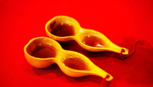经过一段时间的教化,慢慢地新婚夫妇都开始依据“七礼”行事,原本用作教具的葫芦也在婚礼上被奉为礼器:用绳子拴住两个瓢柄,表示夫妇二体合一;又得一仰一合地摆在新房内,象征男俯女仰及子孙繁衍。到了“礼崩乐坏”的春秋时代,孔子重修礼典。修到“婚义七礼”中“敦伦”一节时,他认为这个环节可以省掉了。于是之后的婚礼制度变成了“六礼”。并且把葫芦瓢写入礼书,称为“合卺”,后来演变成夫妻二人同喝交杯酒的酒器。但有的地方仍有人将其一仰一合地放着,还保留了最初的含义。