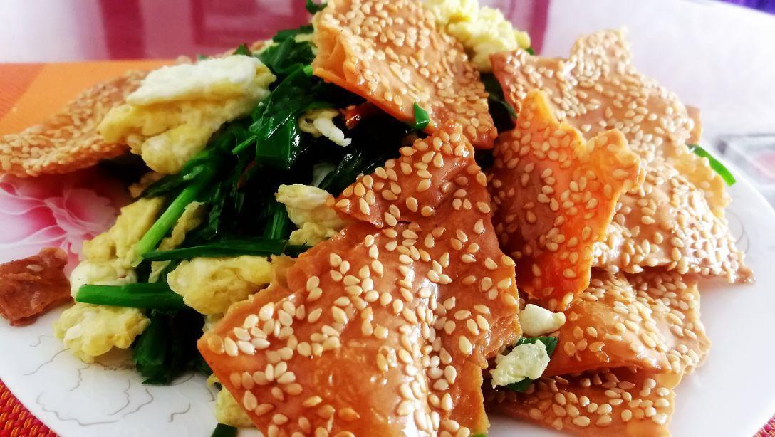 韭菜烧饼炒鸡蛋,烧饼酥脆鲜香,吃了一次还想吃,大人孩子都喜欢