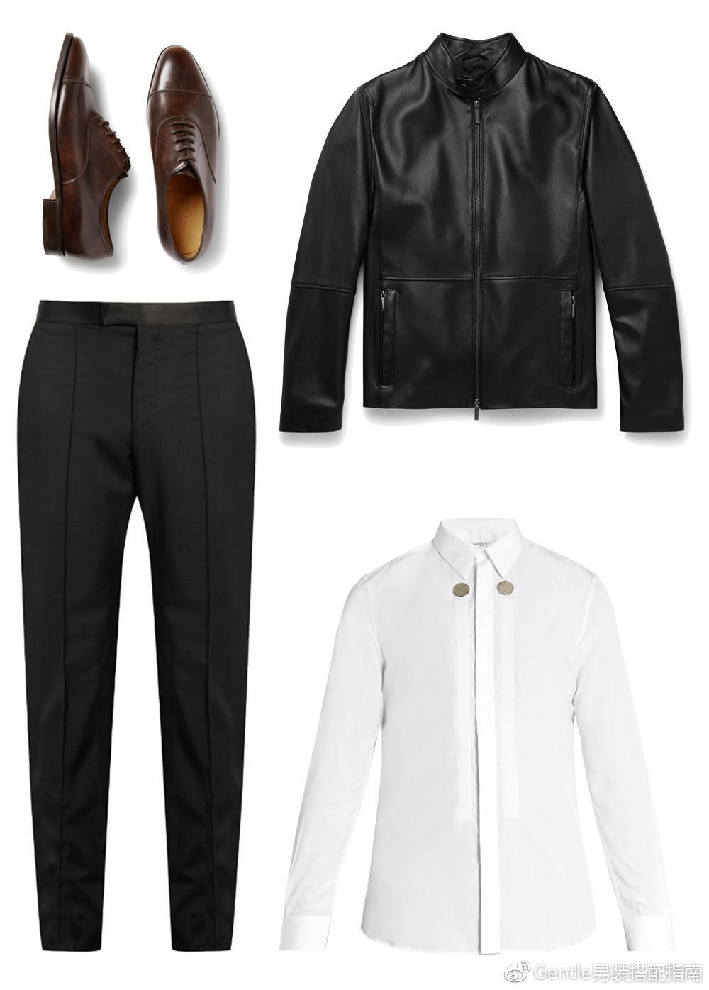 皮夹克为简单的衬衫西裤搭配带了一点酷酷的感觉,同时一双精致的皮鞋也是十分重要的,可以让整体更加正式。