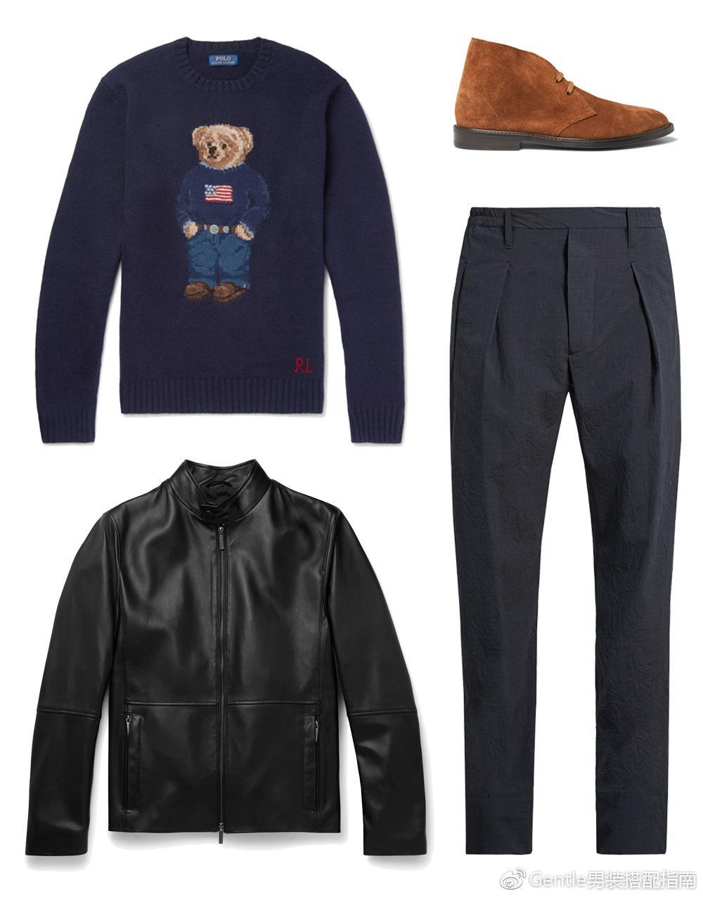 皮夹克搭配西裤和沙漠靴有点过于正经的感觉,用一件小熊印花卫衣来打破这种严肃感,混搭出一种俏皮的味道。