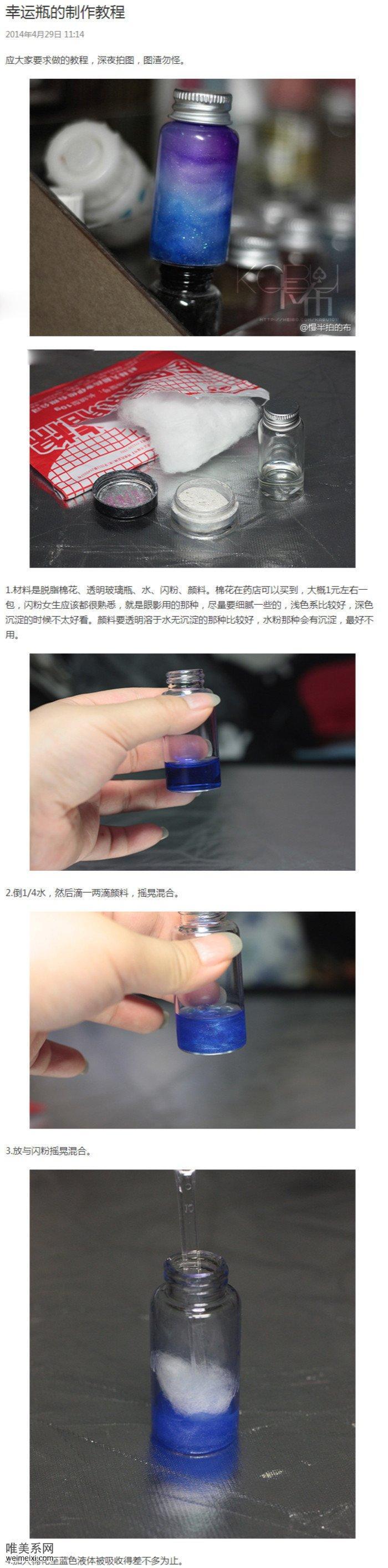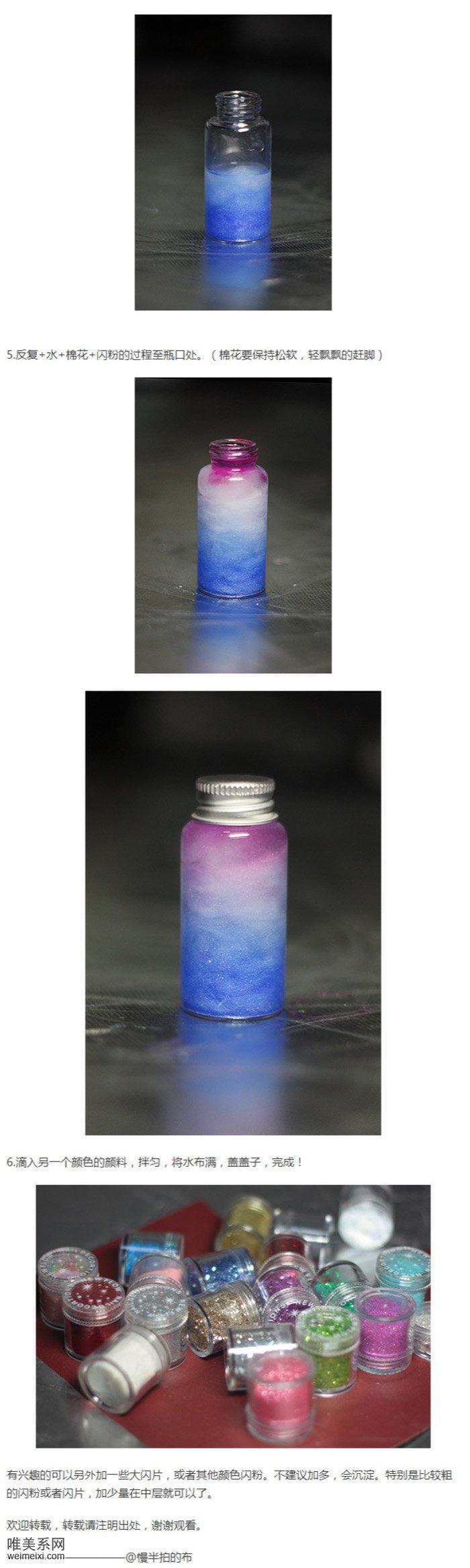 制作的时候将棉花加上水然后侵染颜料,让它有一种渐变的感觉。然后不断的渐变出星空星云的感觉。然后中间夹杂一些闪粉作为点缀效果。最后就能得到一个十分完美的星空幸运瓶了。