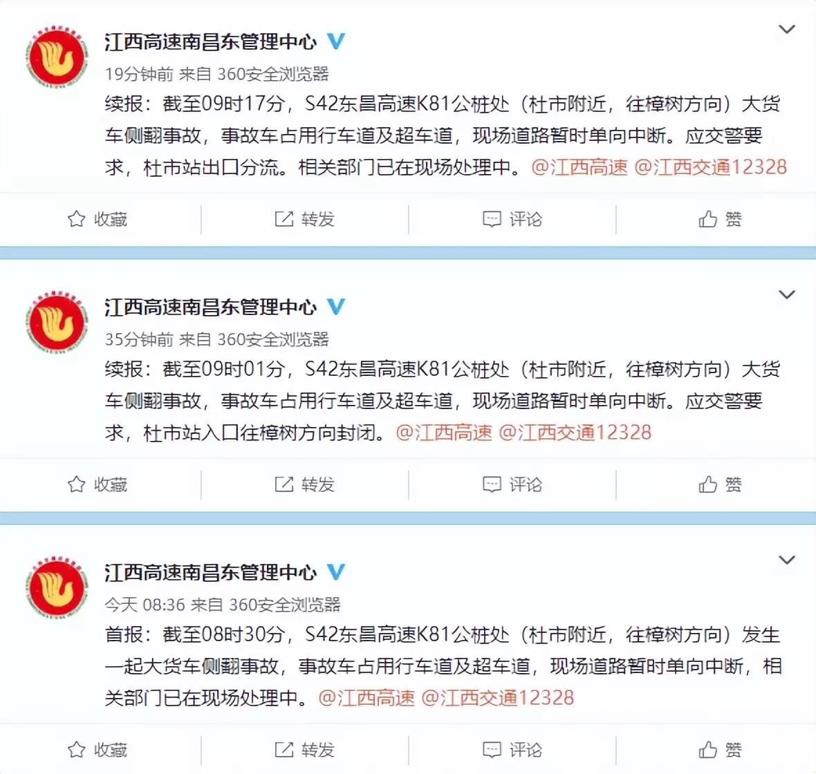 据江西高速南昌东管理中心11月9日官方微博首报:截至08时30分,S42东昌高速K81公桩处(杜市附近,往樟树方向)发生一起大货车侧翻事故,事故车占用行车道及超车道,现场道路暂时单向中断,相关部门已在现场处理中。