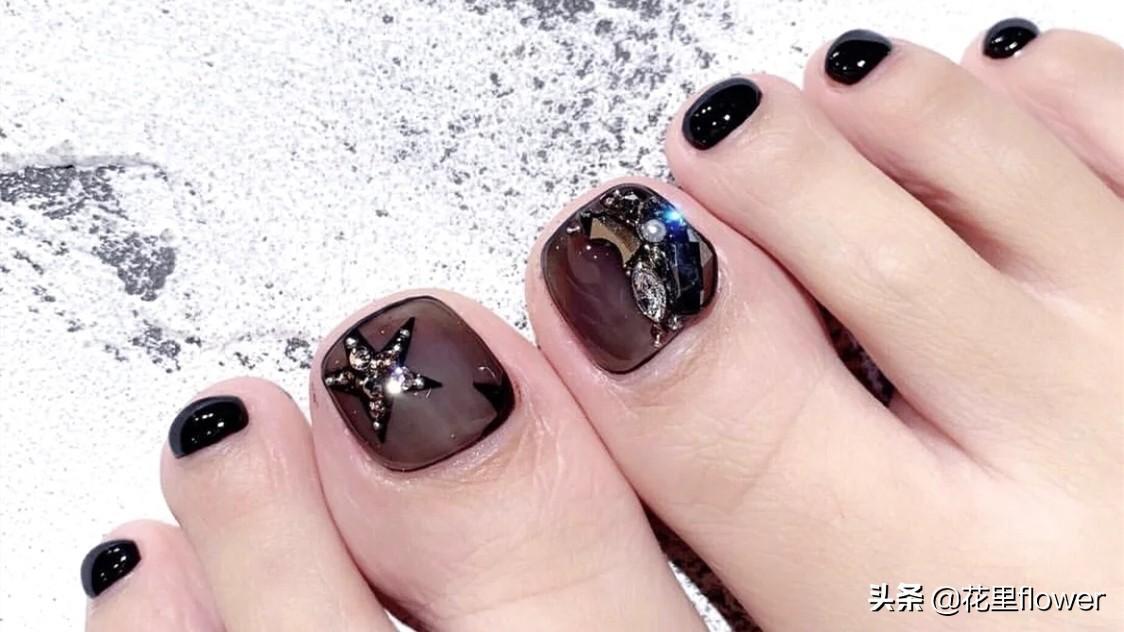 第一款整体采用了黑色,左边大脚趾上面画了一个五角星里面包裹着碎钻,右脚则采用了不规则的形状,上面点缀的大小不一的水钻,其余都是统一的黑色,虽然款式非常简单,但是又透露出一种奢华感~