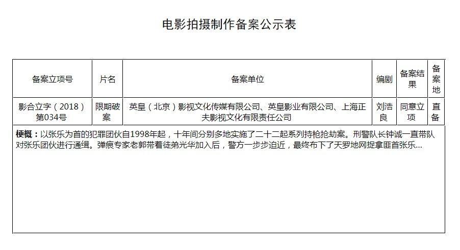1905电影网讯10月23日,国家电影局公布9月下旬全国电影备案、立项公示。在受理的合拍影片部分,英皇影业出品的《限期破案》同意立项。