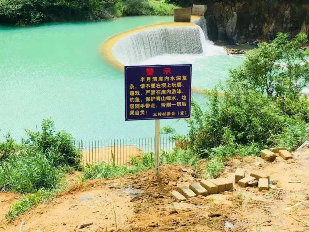 陂洋半月湾、坐落于陆丰市陂洋镇三岭村三板桥旁边、三十多年前由人工建成长约36米的拦水坝、用于三岭村周边农田灌溉。因弯形似半月而得名、它背依青山绿野、环抱碧海清波、镶嵌在青山碧水之间、犹如深邃夜空中的一弯新月。半月湾因为形状酷似一弯新月而得名。