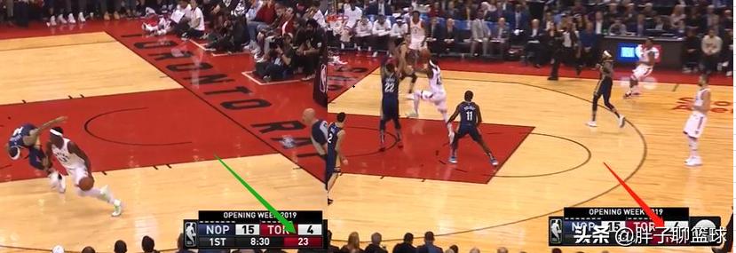快攻的急先锋:猛龙队场均回合数为100.87排名联盟第14位,并不算太出色,但是他们场均快攻得分19.4分高居联盟第1位,场均利用对手失误得分19.6分排名联盟第2位。这里面西卡起到了重要的作用。西亚卡姆凭借着自己的身高臂展加上出色的速度,在进攻或者反击中可以迅速推进,场均通过快攻得分4.3分,队内第一,联盟排名第5名,利用对手失误得分4.1分。建立在高质量的防守强度上,迫使对手失误。篮板球拼抢快速反击,在猛龙的快攻中很多时候都会有西亚卡姆的身影,不论是自己终结进攻还是为队友创造进攻机会。他场均攻防转换参与5.1回合,排名联盟第7位,每回合得分为1.22分,超过了联盟79%的球员。下面这次进攻就能看出西亚卡姆在快攻中起到的作用,自己抢到防守篮板,迅速摆脱防守人,持球快下终结进攻,从23秒抢到后场篮板球到19秒钟出手,仅仅耗时4秒钟。