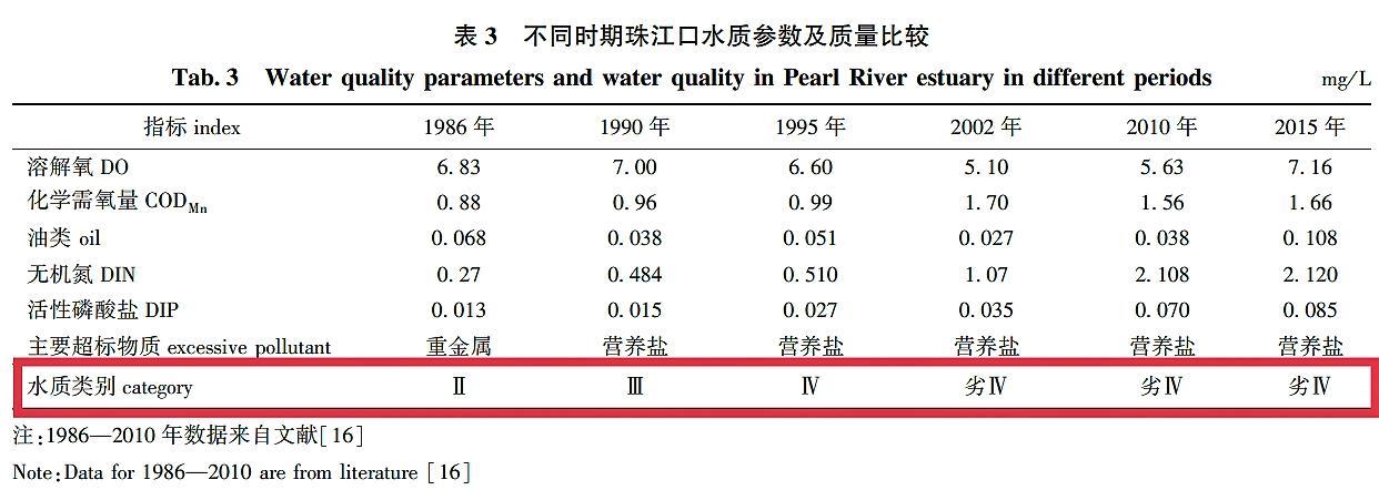2001~2010年的水质调查显示,工业废水、生活污水已经成为珠江口的主要污染源。珠江口的富营养化程度相当高,无机氮和活性磷酸盐的含量基本位于劣IV类海水的标准范围内,水质状况已多年未见好转。