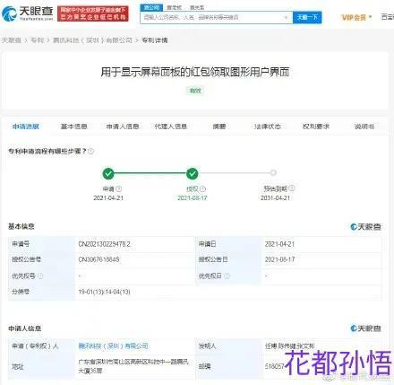 据天眼查APP显示,腾讯科技有限公司获得“用于显示屏幕面板的红包领取图形用户界面”专利授权,申请日期为2021年4月。