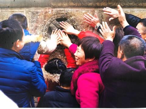7.从大庙往里走的时候,记得摸墙壁上的铜钱,男左手女右手摸,摸完放口袋里面,表示把南岳的财气福气带回家。