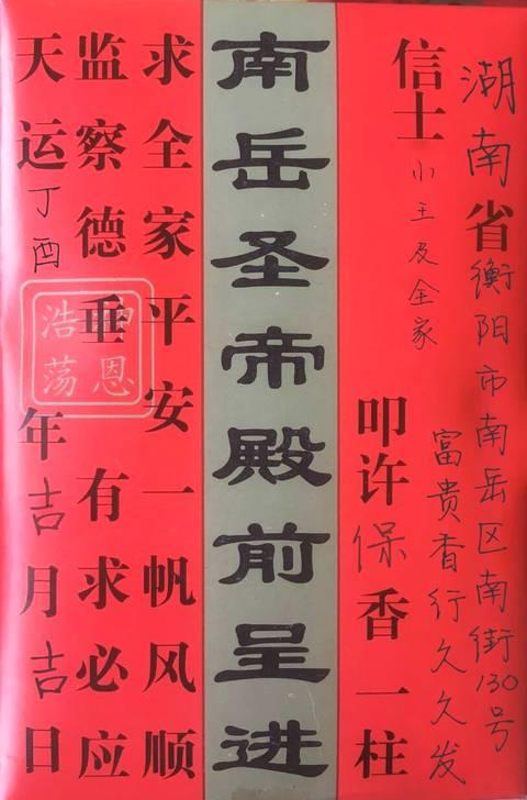 大庙是佛道一体的,一共有八位神轼,所以一共有八个香包,大家要在每个香包上写明自己的姓名、住址、烧的什么香和年月日,日期用天干历,比如庚寅年什么的。记得地址写详细点。 一套平安香包括: 香包8个(8个香包分别为8个菩萨。红色包装,里面装着碎的檀香木)、拜香一盒、配香8盒、黄纸、钱纸若干,蜡烛一对,檀木一根。可以陶宝’搜富贵香。行久久发’威,信资讯小王1.8‘6’920;31282教正确书写香包及专业介绍烧香规矩。 1、XXXX殿前呈进:XXXX代表菩萨神仙的封号。 2、右边的**省**信士 叩**香一柱 **省: 写具体地址。比如:湖南省衡阳市南岳区南街130号富贵香行久久发。 **信士: 信士则写自己的名字如:信士 小王(或者小王及全家) 若是为别人烧的香,请写别人的地址/ 姓名。 叩**香一柱:保香写“叩许保香一柱”, 若是来许愿,为“叩许许香一柱”,还愿,为“叩许还香一柱”。 3、左边的天运****年**月**日:写农历(即阴历)日期。 以上请用黑色的水笔书写。