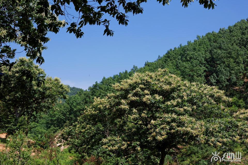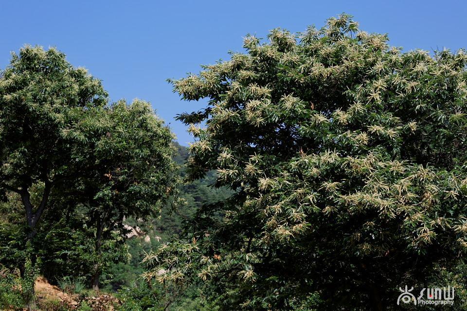 这时节,正值泰山板栗花开,那一片片乳白色的花密集交错地伸展着,在一望无际的绿色中铺了淡淡的一层,说不上好看,但也很壮观。