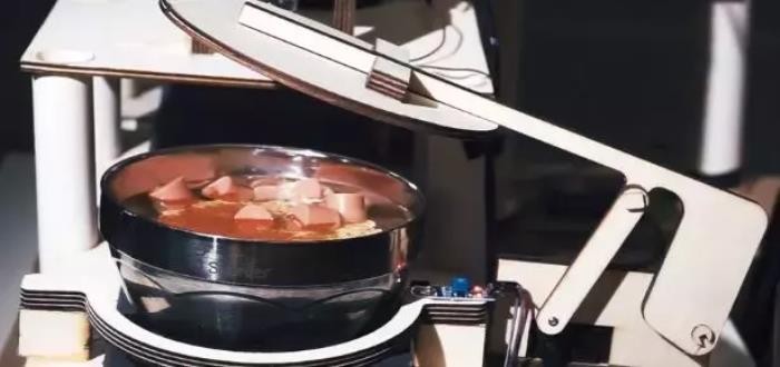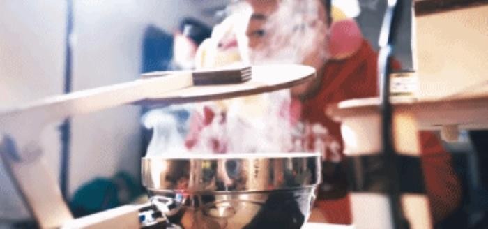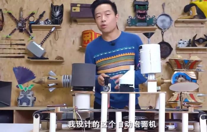 其实他也只是做了一个传送带,把泡面的几个步骤分开,比如说放面饼、调料、火腿肠、加热水等等。